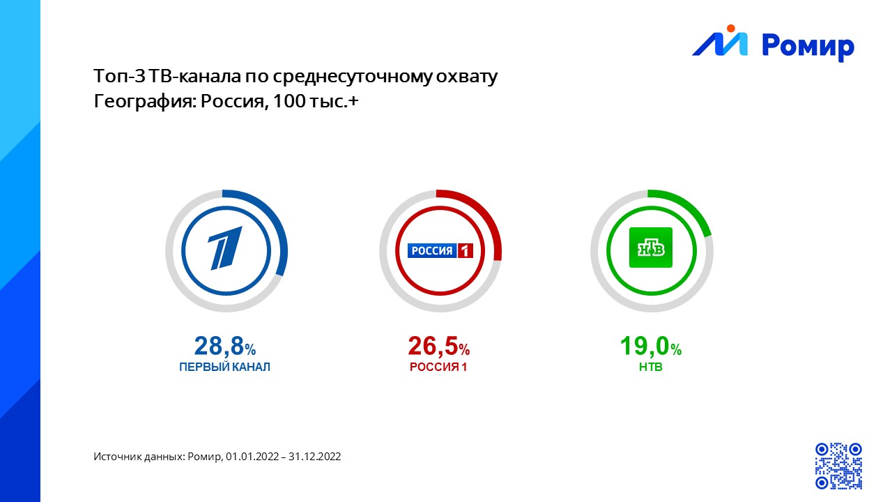 По данным медиапанели «Ромир», в 2022 году среднесуточный охват аудитории телевидения вырос до 72,6%, – такой процент населения российских городов численностью более 100 тыс. чел., которые хотя бы раз в сутки включали телевизор. В 2021 году этот показатель составлял 71,3%. Частота просмотров телевидения также несколько выросла: с 261 до 264 раз в год.