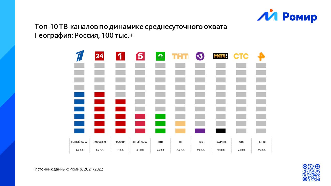 Лидерами по приросту аудитории стали Первый канал (+5,3 п.п.), Россия 24 (+5,3 п.п.), и Россия 1 (+4,4 п.п.). Пятый канал - на четвертом месте по приросту аудитории (+2,1 п.п.), на пятом месте – НТВ (+ 2,6 п.п.). Замыкают десятку лидеров по динамике среднесуточного охвата ТНТ, ТВ3, МАТЧ ТВ, СТС и РЕН ТВ.