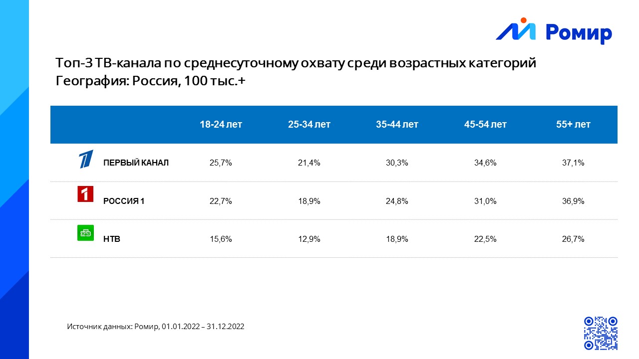 Наибольший прирост телесмотрения в 2022 году был среди молодой аудитории (18 – 24 лет). Среднесуточный охват телевидения среди «цифрового» поколения вырос на 3,5 процентных пункта – до 69,8%. Первый канал стал наиболее популярным каналом среди молодежи: его смотрят 25,7% молодых россиян (18 – 24 лет), прирост, по сравнению с 2021 годом, составил 7,6 п.п. На втором месте у молодых телезрителей - Россия 1 (22,7%) с приростом 5,7 п.п. по сравнению с 2021 годом. НТВ (15,6%), который прибавил 3,1 п.п. – на третьем месте. Первый канал и Россия 1 занимают 1 и 2 место соответственно среди всех возрастных аудиторий.