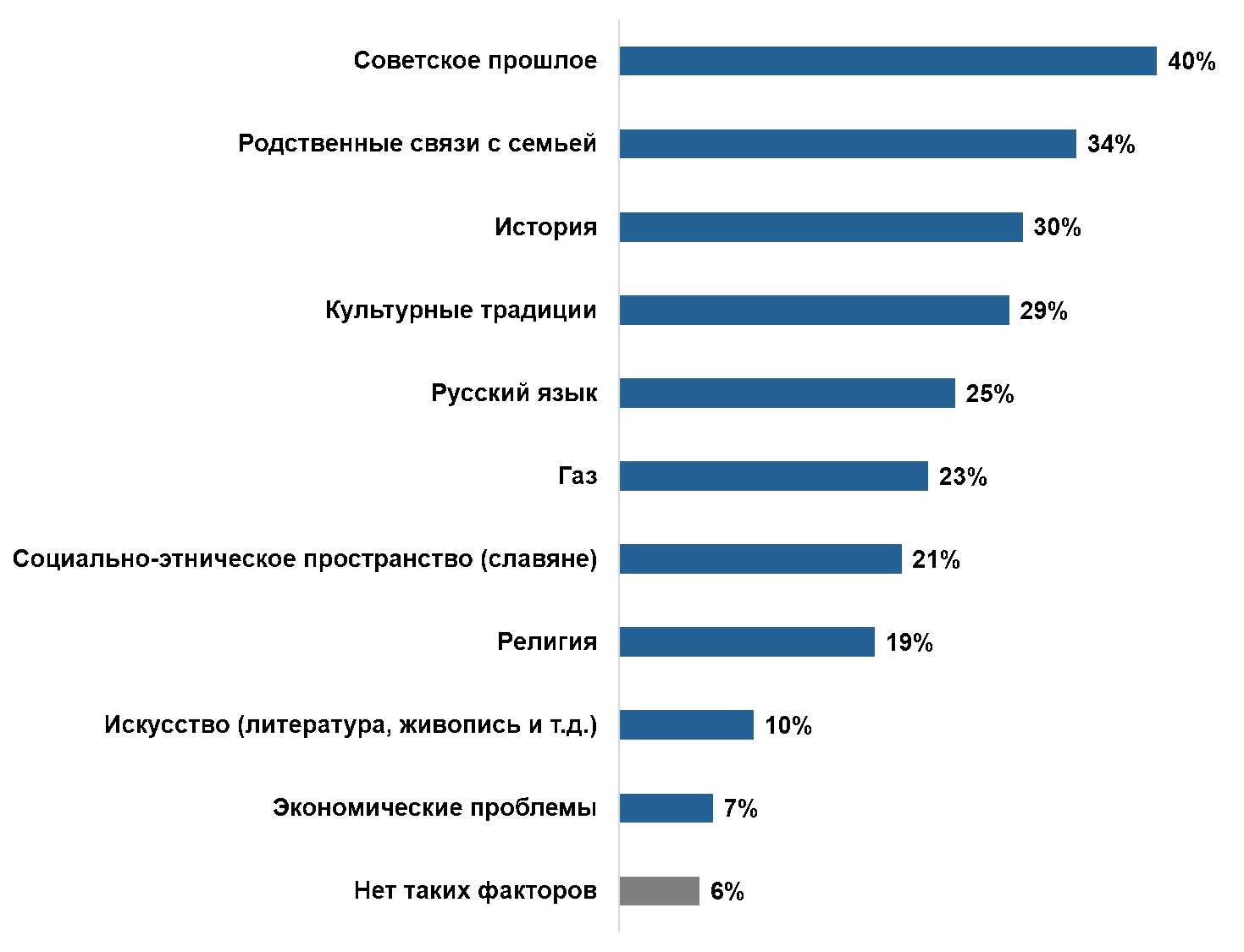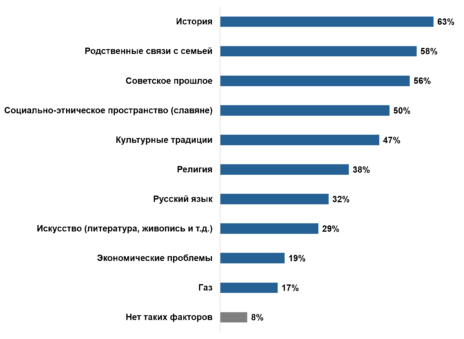 47% украинцев, рассуждая о связях двух стран и двух народов, также назвали объединяющим фактором культурные традиции. Религия и русский язык стали связующим звеном для 38% и 32% соответственно. 19% считают, что у обеих стран общие экономические проблемы. Лишь 17% украинцев среди связывающих две страны факторов назвали газ. 8% опрошенных заявили, что вообще не существует никаких связующих элементов между Украиной и Россией.
