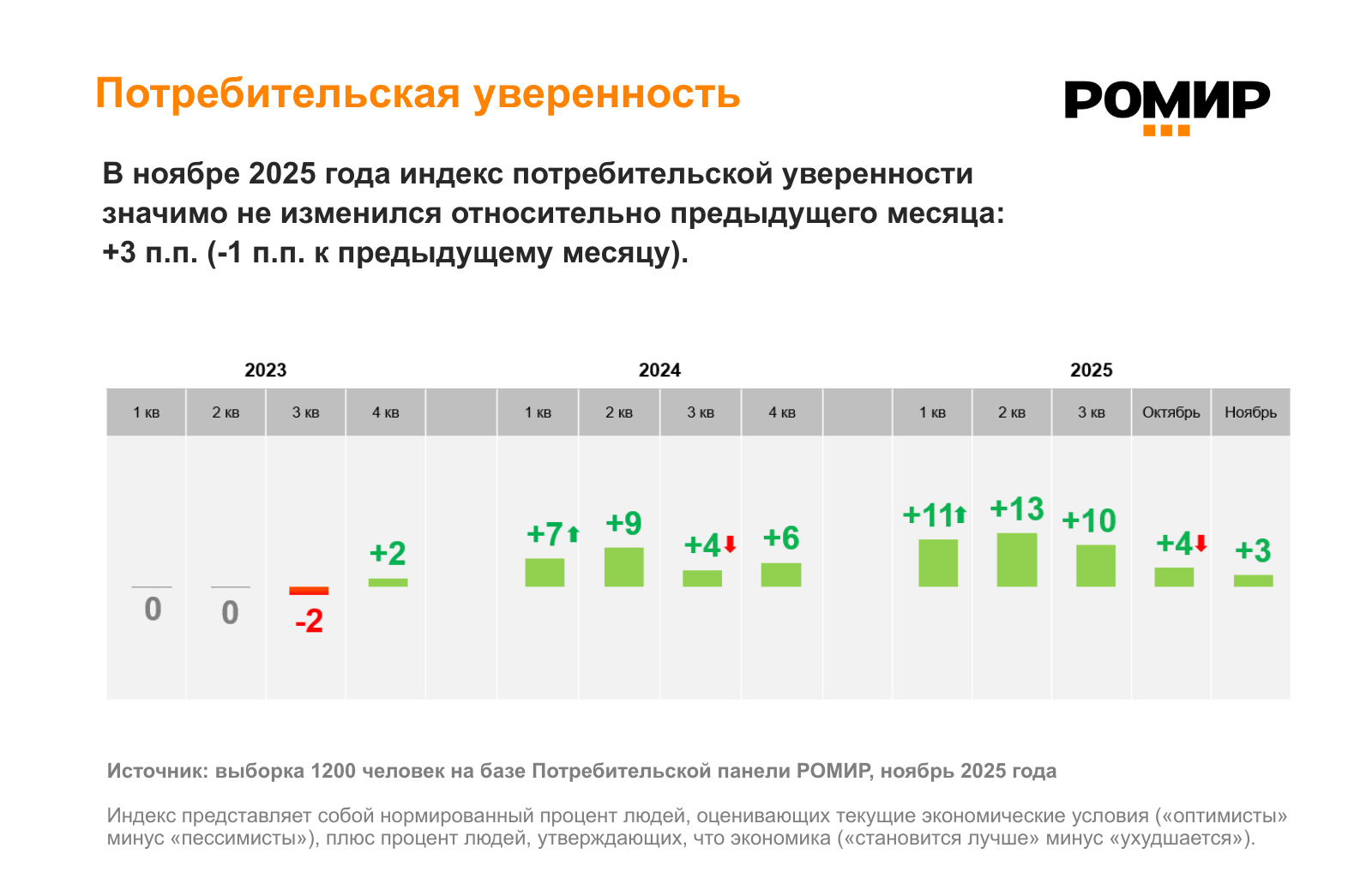 Согласно данным РОМИР, в ноябре 2025 года индекс потребительской уверенности продемонстрировал минимальные колебания, сохранив позиции предыдущего периода.