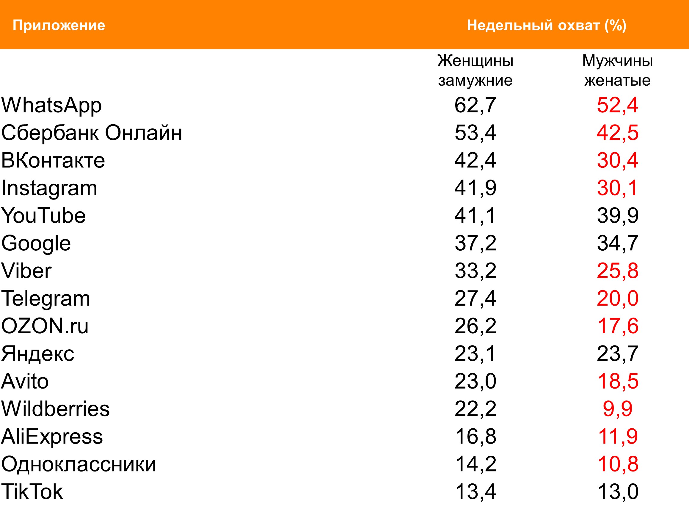 На неделе с 4 по 10 октября анализировалось медиапотребление и использование интернет-сервисов замужними женщинами и женатыми мужчинами. Вторая целевая аудитория реже россиянок, вышедших замуж, на прошлой неделе использовала практически все приложения: WhatsApp, «Сбербанк Онлайн», VK, Instagram, Wildberries и другие.