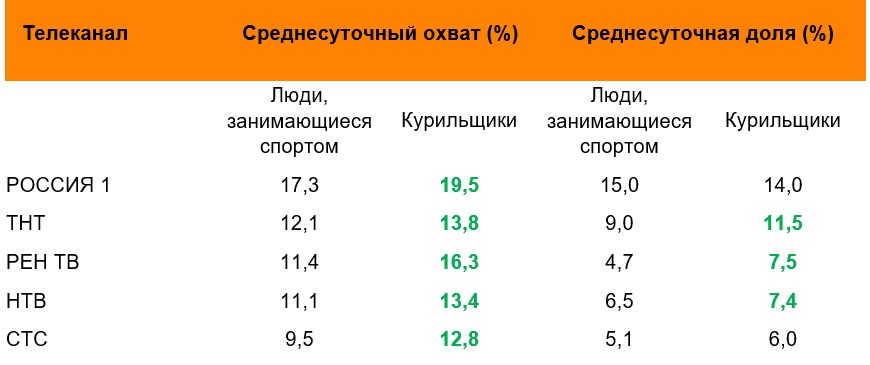 Судя по охвату телеканалов, по которым отмечены наибольшие различия, физически активные россияне на прошлой неделе реже смотрели телевизор, чем курильщики. Охват аудитории среди людей, занимающихся спортом, меньше по большинству телеканалов. Наибольшая разница отмечена в среднесуточном охвате аудитории телеканала РЕН ТВ (11,4% - спортсмены vs 16,3% - курильщики).