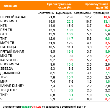 На прошлой неделе курильщики чаще спортсменов смотрели телеканалы «Россия-1», «Рен-ТВ», СТС, ТНТ, «Пятый канал», «Россия-24», «Домашний», ТВ-3, ТВЦ, ТНТ4, ЧЕ, но реже «Карусель».