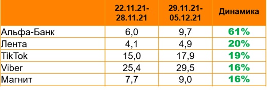 На четвертом и пятом месте по динамике – Viber и «Магнит», охват аудитории которых вырос на 16%.