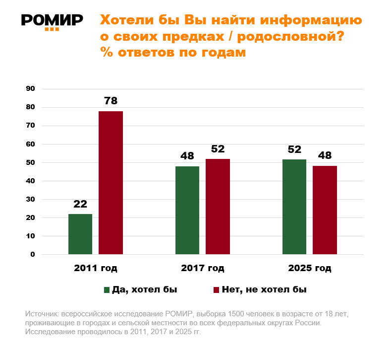 За последние 14 лет интерес к семейной истории в российском обществе существенно вырос. Если в 2011 году лишь 22% респондентов выражали желание найти информацию о своих предках, то к 2025 году этот показатель достиг 52%. Таким образом, сегодня более половины жителей страны хотели бы знать свое генеалогическое древо.