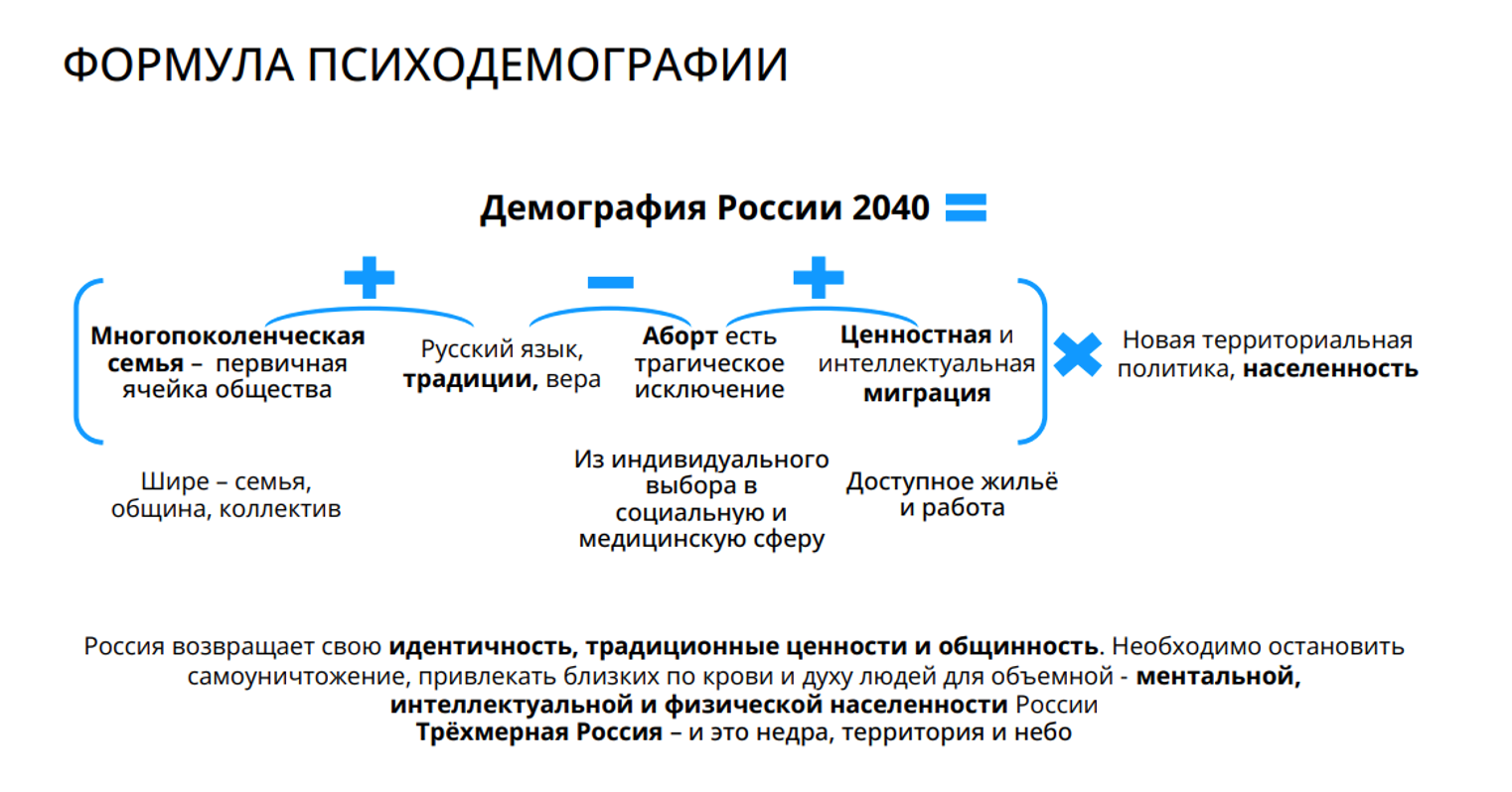 …Задача России особенная – немедленно остановить падение рождаемости и в целях благоустройства и защиты собственного макрорегиона значительно увеличить своё население. В этом уникальность ситуации: наши цели вступают в прямой̆ конфликт с западной̆ демографической̆ стратегией, за которой̆ мы 30 лет обреченно следовали, и имеют огромный̆ потенциал взаимодействия с южной̆ и восточной̆ моделями…