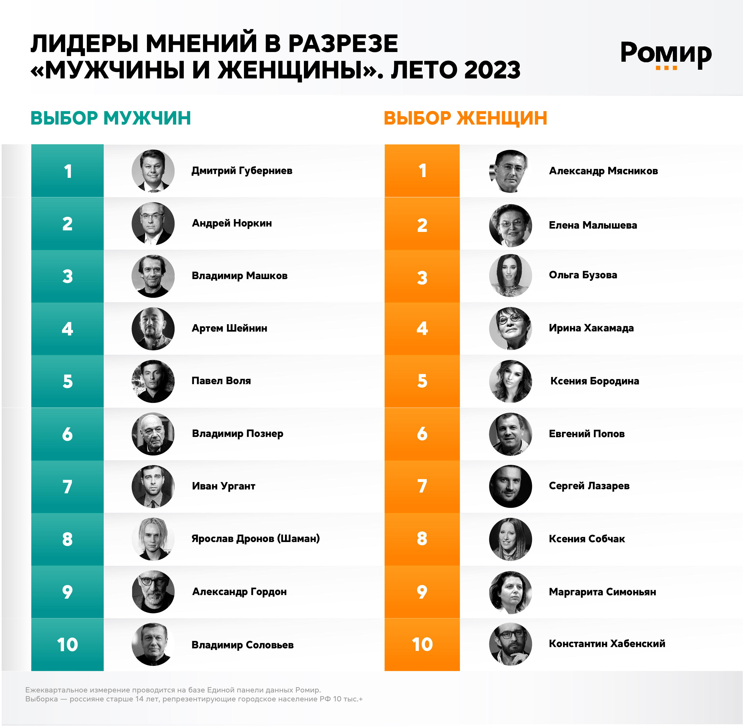 В летнем списке лидеров мнений среди мужчин России первое место занял спортивный комментатор Дмитрий Губерниев. Второе — журналист и телеведущий Андрей Норкин, третье — актер Владимир Машков. Примечательно, что в список значимых для мужчин персон не попала ни одна представительница противоположного пола.