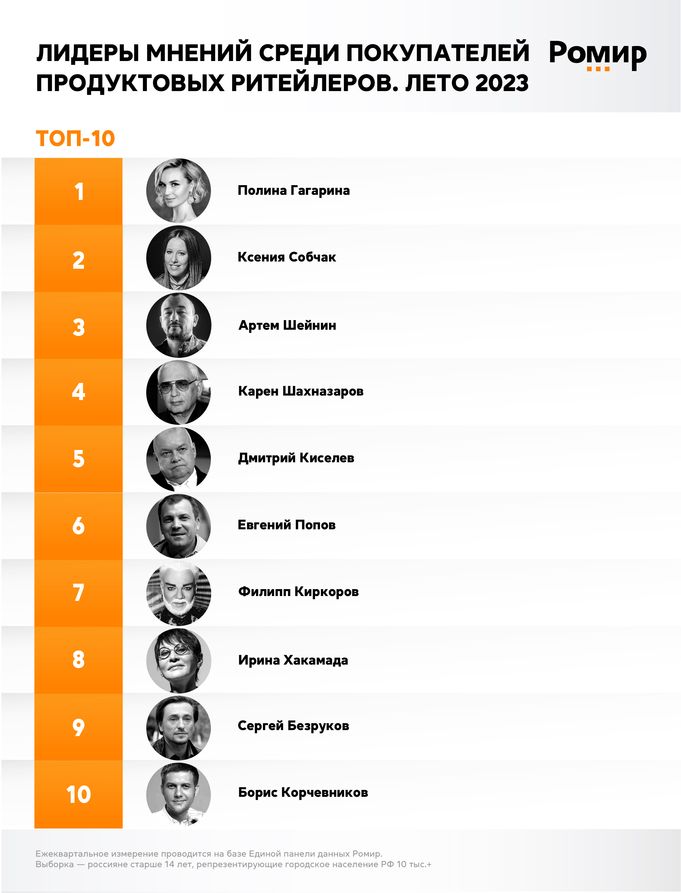 В летнем списке лидеров мнений среди посетителей точек продуктовых ритейлеров — сети “Перекресток”, “Пятерочка”, “Лента” и “Магнит” — первые три строки заняли певица Полина Гагарина, журналистка Ксения Собчак и телеведущий Артем Шейнин.