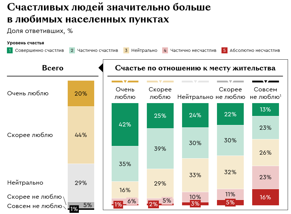 Около 77% россиян, которые любят свое текущее место проживания, считают себя счастливыми