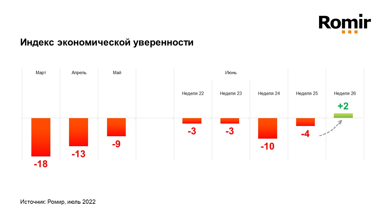 За 18 недель исследования индекс экономической уверенности россиян** впервые достиг положительного значения. В период с 27 июня по 3 июля показатель вырос до +2. Это на 6 пунктов больше, чем неделей ранее. Показатель растет за счет доли россиян, которые замечают некоторые проблемы экономического характера, но не считают, что страна находится в кризисе.