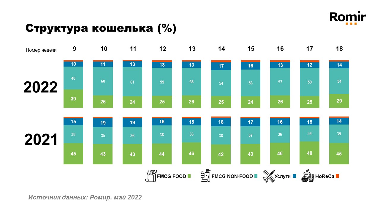 Исследование М-Пульс показало, что между майскими праздниками люди увеличили долю трат на продукты в кошельке до 29%. Перераспределение трат на продукты произошло за счёт увеличения доли гипермаркетов, специализированных и онлайн-магазинов в репертуаре потребителей.