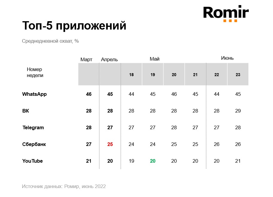 Общение является одной из ключевых ценностей для человека, в связи с чем мессенджеры и социальные сети занимают первые строчки рейтинга приложений по среднедневному охвату аудитории. Охват мессенджера WhatsApp в среднем в день стабильно составляет 44-46%, ВКонтакте на прошлой неделе пользовались 29%, а охват Telegram вырос до 28%.