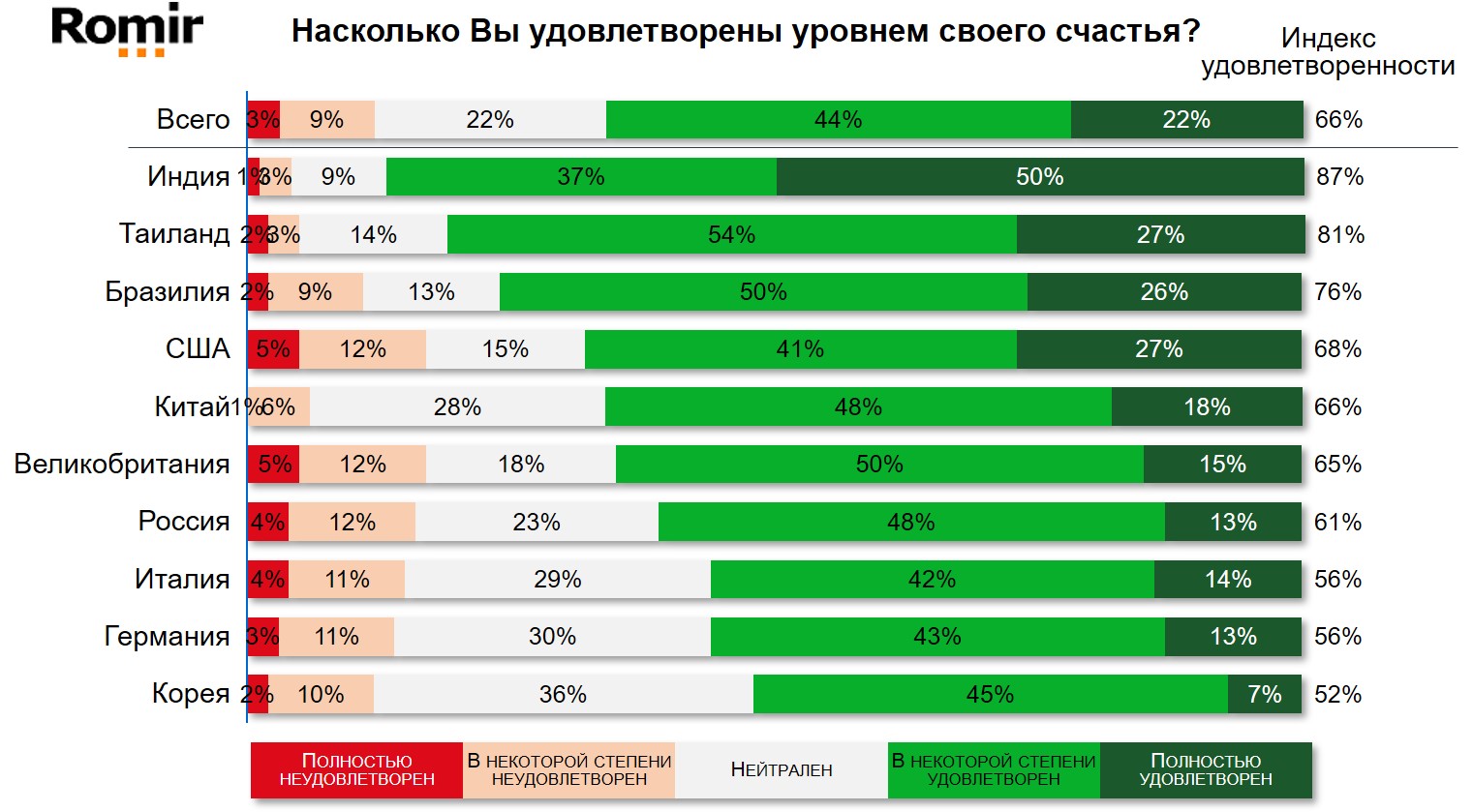 Средний индекс удовлетворенности уровнем счастья по странам, участвовавшим в исследовании, составил 66%. 22% опрошенных респондентов высказались нейтрально, а 11% выразили неудовлетворенность. Самая низкая доля неудовлетворённости уровнем счастья среди респондентов в Индии, Таиланде и Китае – 4%, 5%, и 6% соответственно, в остальных странах этот показатель находится в диапазоне 11-17%.