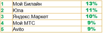 Лидирует по динамике охвата приложение «Мой Билайн» (+13%). Далее следует вошедшее в экосистему ВКонтакте приложение «Юла» (+11%). На третьем и пятом местах расположились «Яндекс.Маркет» (+10%) и Avito (+9%). Между ними на четвертом месте находится приложение «Мой МТС» (+9%).