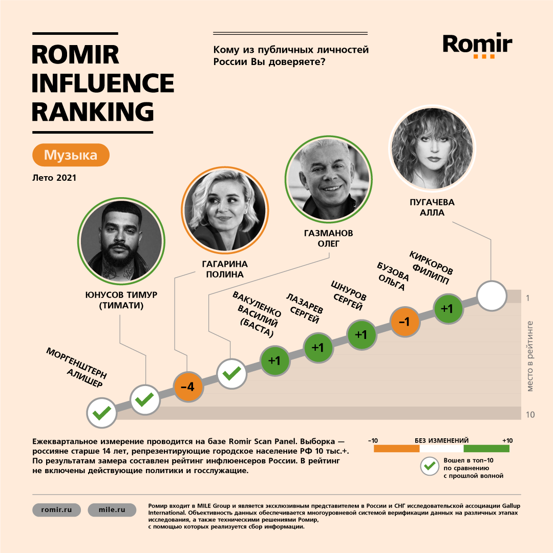 Рейтинг инфлюенсеров топ-10 музыкальных исполнителей, которые пользуются наибольшим доверием у россиян.