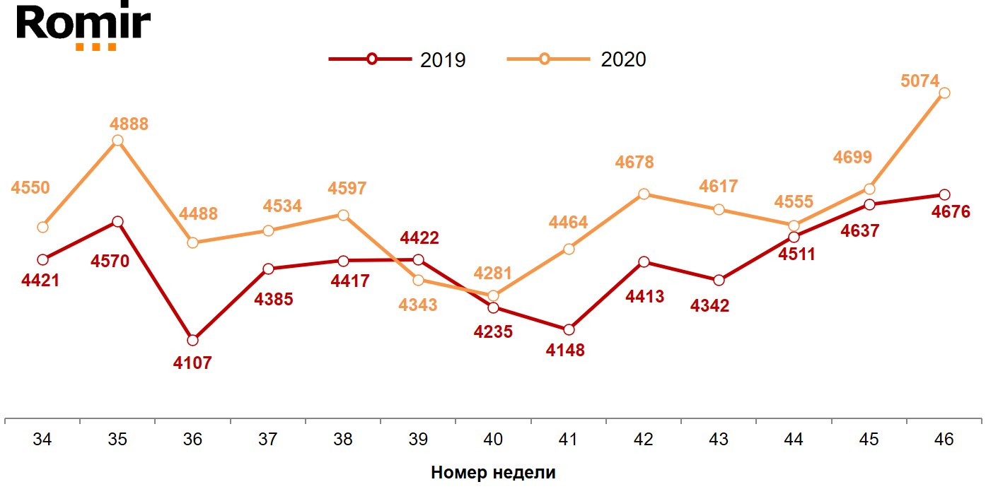 С 9 по 15 ноября 2020 года недельные расходы россиян выросли, достигнув уровня 5074 рублей.