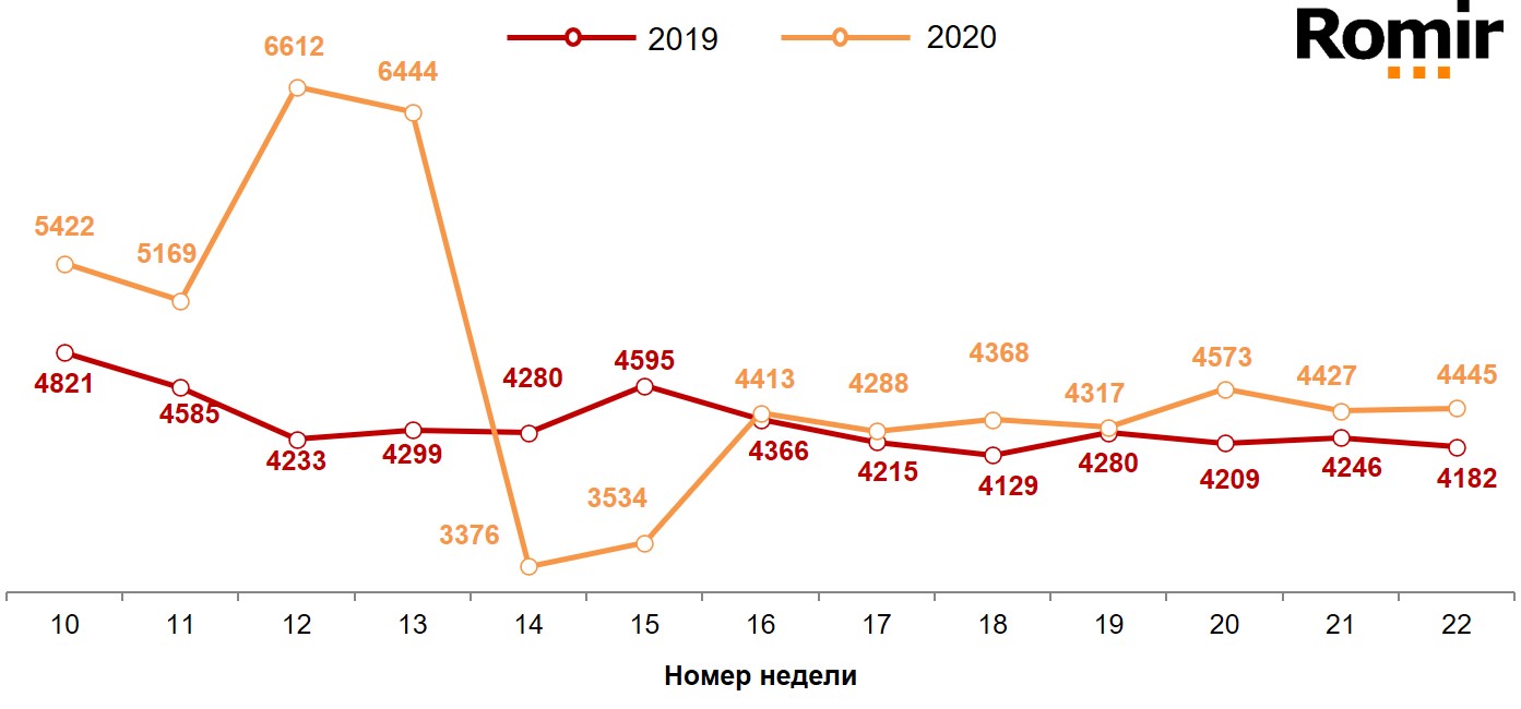 График 1. Динамика недельных номинальных повседневных расходов (в рублях) жителей российских городов с населением от 100 тысяч жителей. 2019-2020 год, недели 10-22.