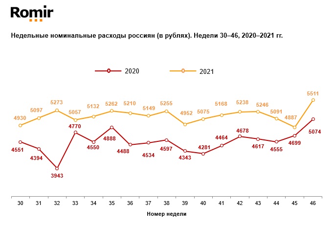За неделю с 15 по 21 ноября 2021 года средние недельные расходы россиян составили 5511 рублей, что на 13% (204 рубля) больше, чем на прошлой неделе. Это самый высокий показатель индекса с начала года.