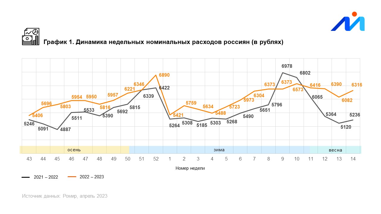 Так, за 14-ю неделю года (в период с 3 по 9 апреля) средние расходы россиян увеличились на 4% в сравнении с 13-й неделей и составили в денежном выражении 6316 рублей. В годовой динамике индекс вырос на 21%.
