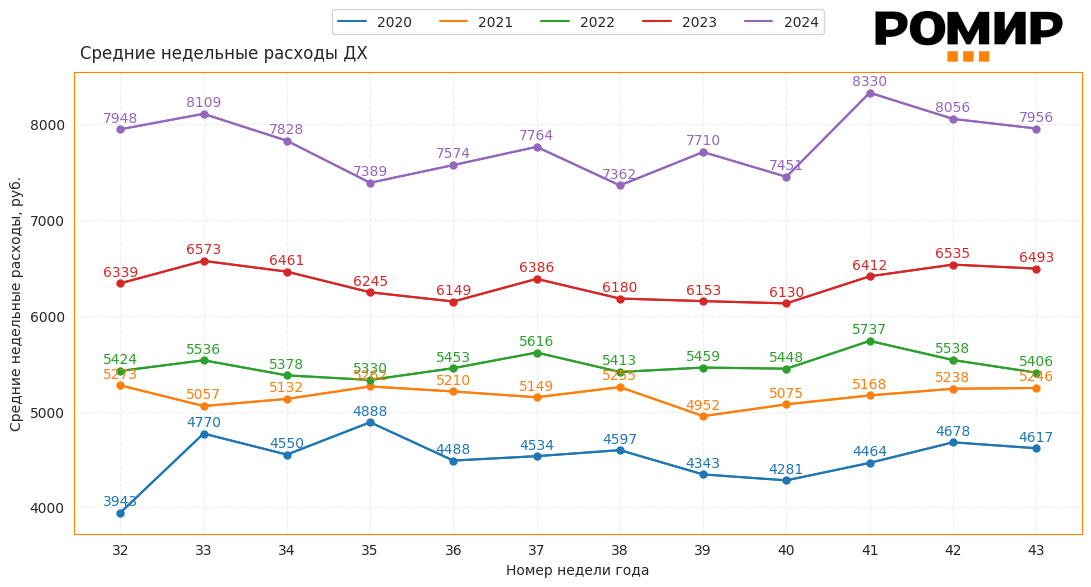 На прошедшей 43 неделе года (с 21 по 27 октября) среднестатистическая российская семья потратила на покупку продуктов и товаров повседневного спроса 7956 рублей. Таким образом, общий объем семейных трат за неделю сократился на 100 руб. или на 1,3%. Значение Индекса ИПА составило 272,2%. Относительно аналогичной недели прошлого года объем недельных расходов вырос на 1463 руб. или на 22,5%.