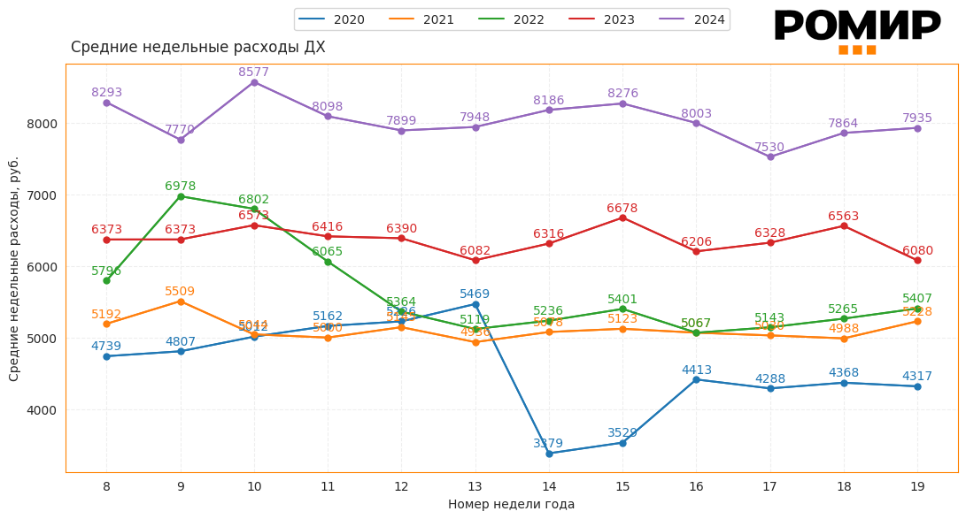 Индекс недельных расходов (ИНР) показывает динамику объема потребления товаров повседневного спроса россиянами и рассчитывается для каждой календарной недели на основе Единой панели данных Ромир.