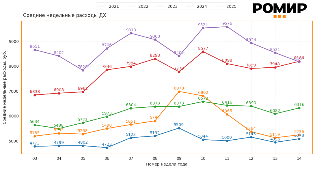 Диаграмма 1. Динамика Индекса недельных расходов, руб., 2021–2025 гг.
