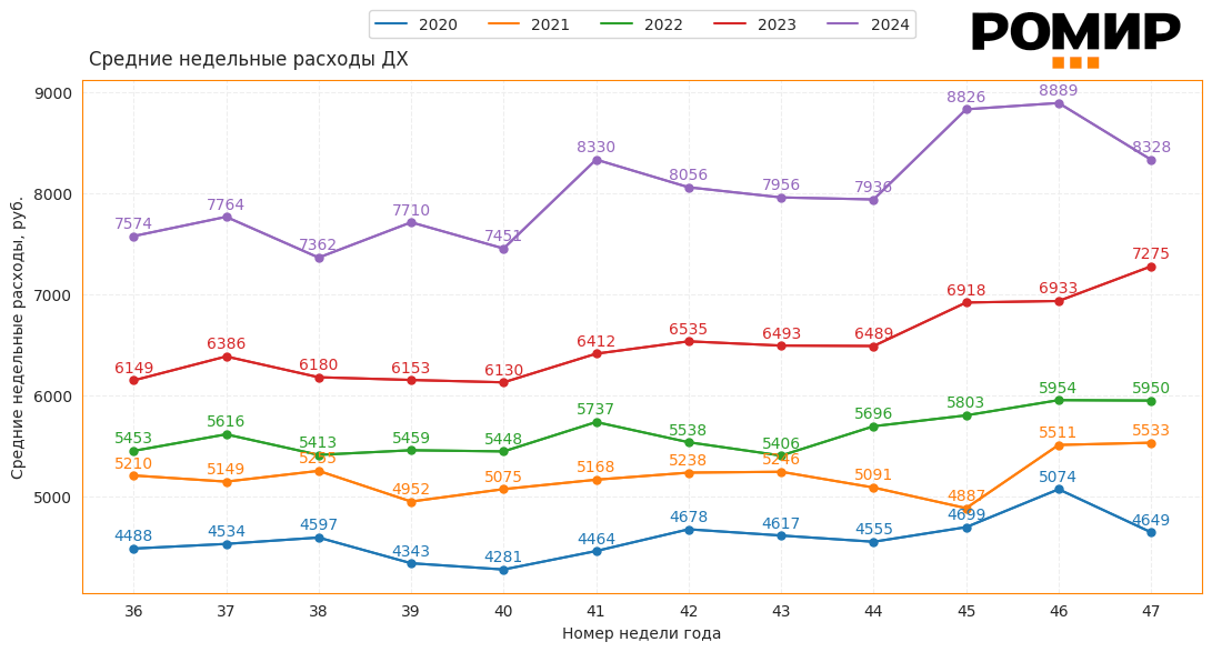 Диаграмма 1. Динамика Индекса недельных расходов, руб., 2020–2024 гг.