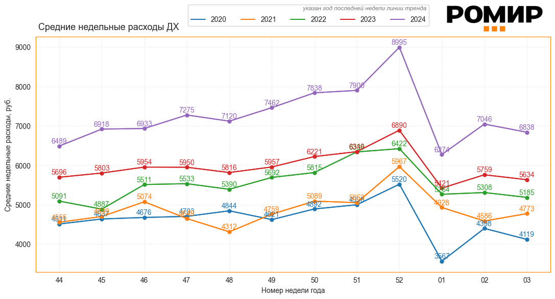 Диаграмма 1. Динамика Индекса недельных расходов, руб., 2020–2024 гг.
