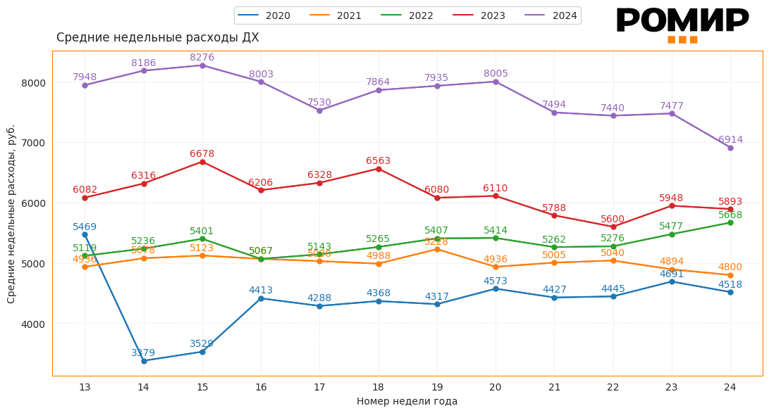 Важно отметить, что в первые две недели июня недельные расходы демонстрировали относительную стабильность (7440 рублей и 7477 рублей соответственно), что может свидетельствовать об адаптации потребителей к текущим экономическим условиям.