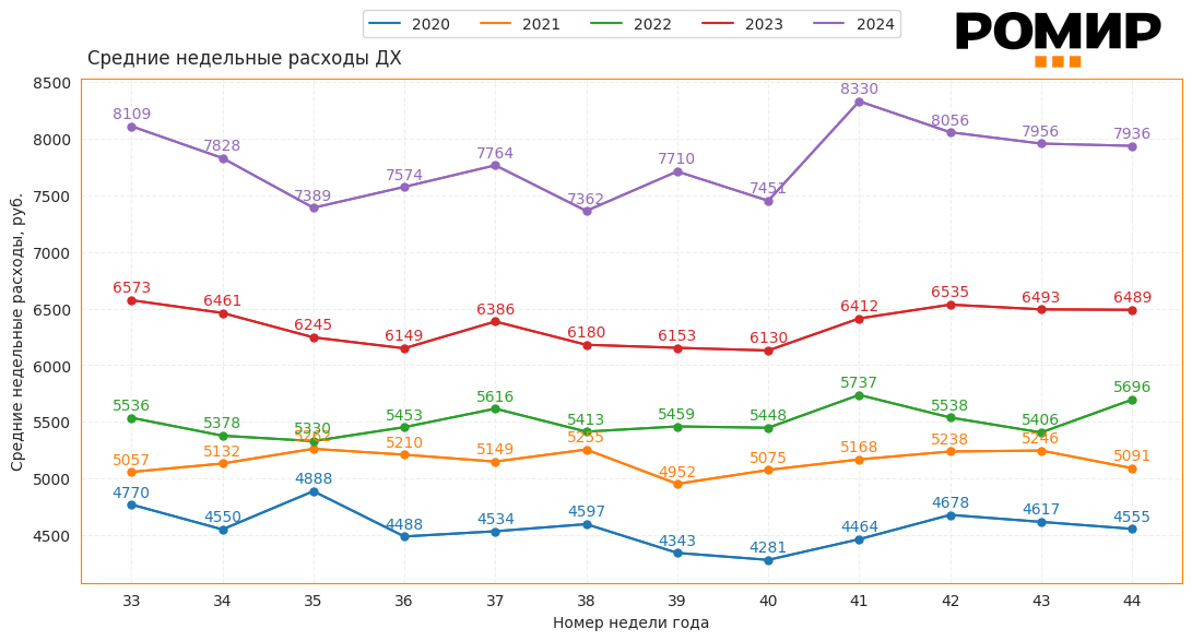 Диаграмма 1. Динамика Индекса недельных расходов, руб., 2020–2024 гг.