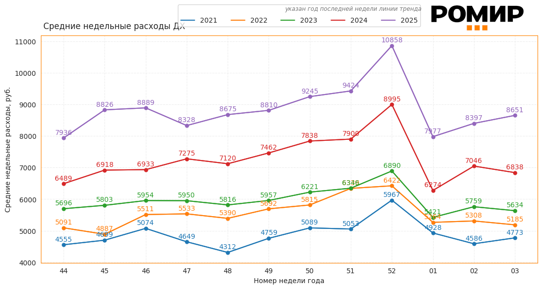 Индекс недельных расходов (ИНР) показывает динамику объема потребления товаров повседневного спроса россиянами и рассчитывается для каждой календарной недели на основе Единой панели данных Ромир.