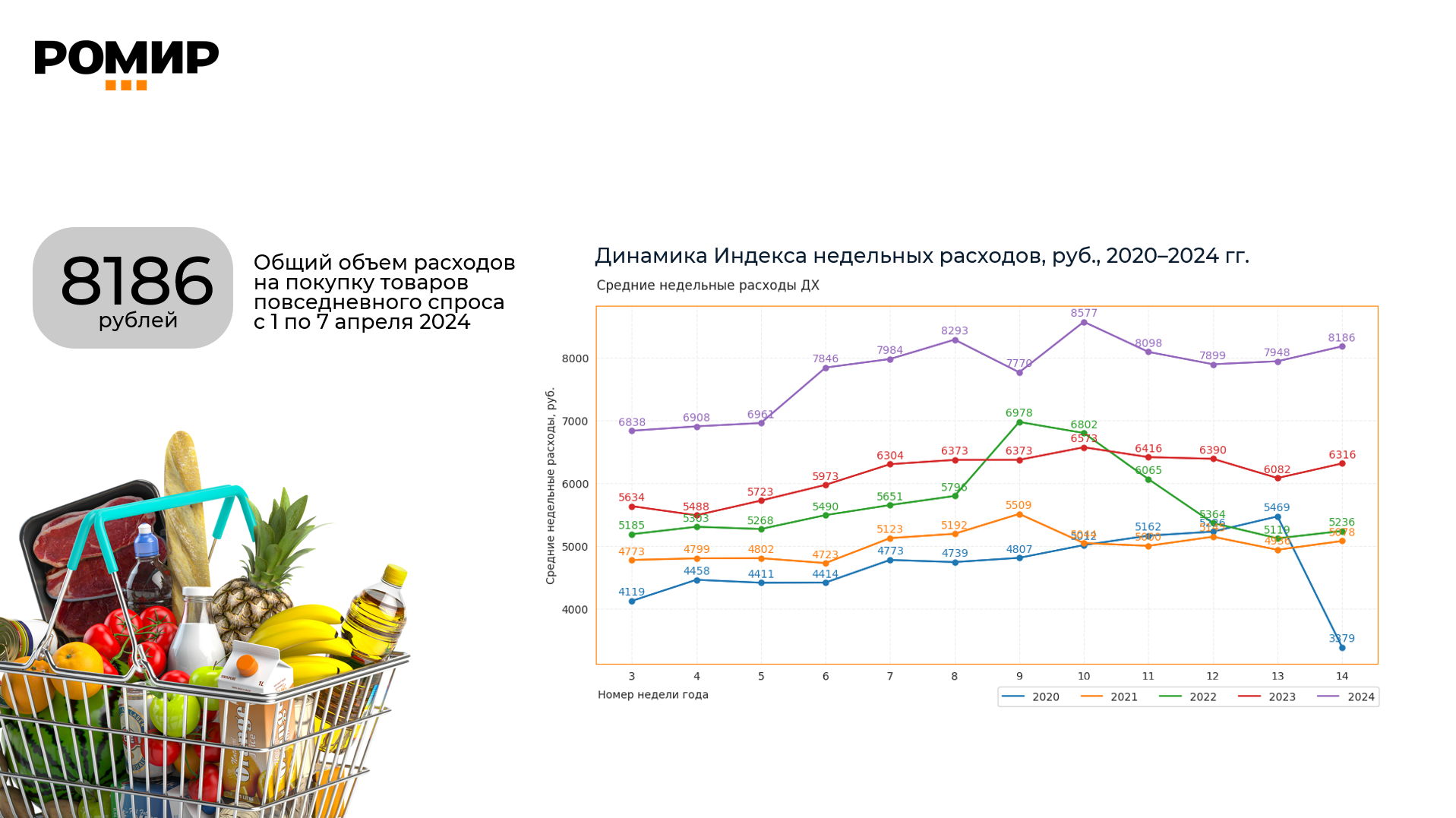 На прошедшей 14 неделе года (с 1 по 7 апреля) общий объем расходов среднестатистической российской семьи на продукты питания и товары повседневного спроса в среднем составил 8186 руб. За период общий объем трат увеличился на 238 рублей или на 3%. Таким образом, Индекс ИПА достиг значения в 280,1%. Относительно аналогичной недели прошлого года размер еженедельных трат российских домохозяйств вырос на 1870 руб. или на 29,6%.
