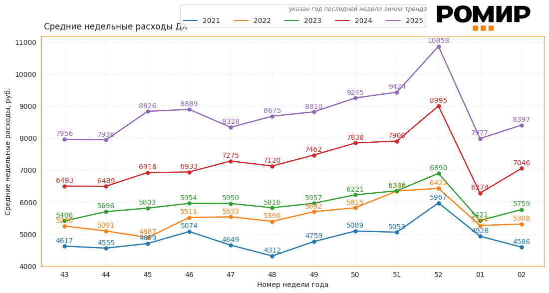 Диаграмма 1. Динамика Индекса недельных расходов, руб., 2021–2025 гг.