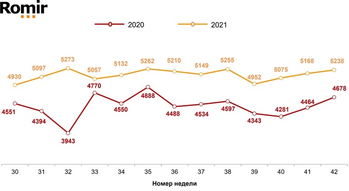 Недельные номинальные расходы россиян (в рублях). Недели 30–42, 2020-2021 гг.