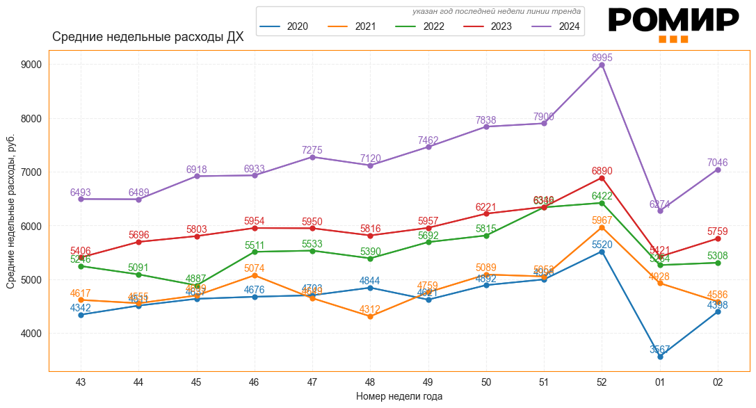 Диаграмма 1. Динамика Индекса недельных расходов, руб., 2020–2024 гг.