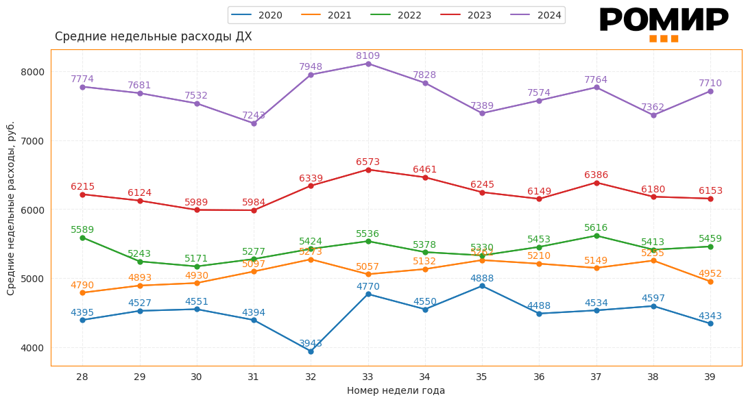 На прошедшей 39 неделе года (с 23 по 29 сентября) среднестатистическая российская семья потратила на покупку продуктов и товаров повседневного спроса 7710 рублей. Таким образом, общий объем семейных трат за неделю вырос на 348 руб. или на 4,5%. Значение Индекса ИПА составило 263,8%. Относительно аналогичной недели прошлого года объем недельных расходов вырос на 1557 руб. или на 25,3%.