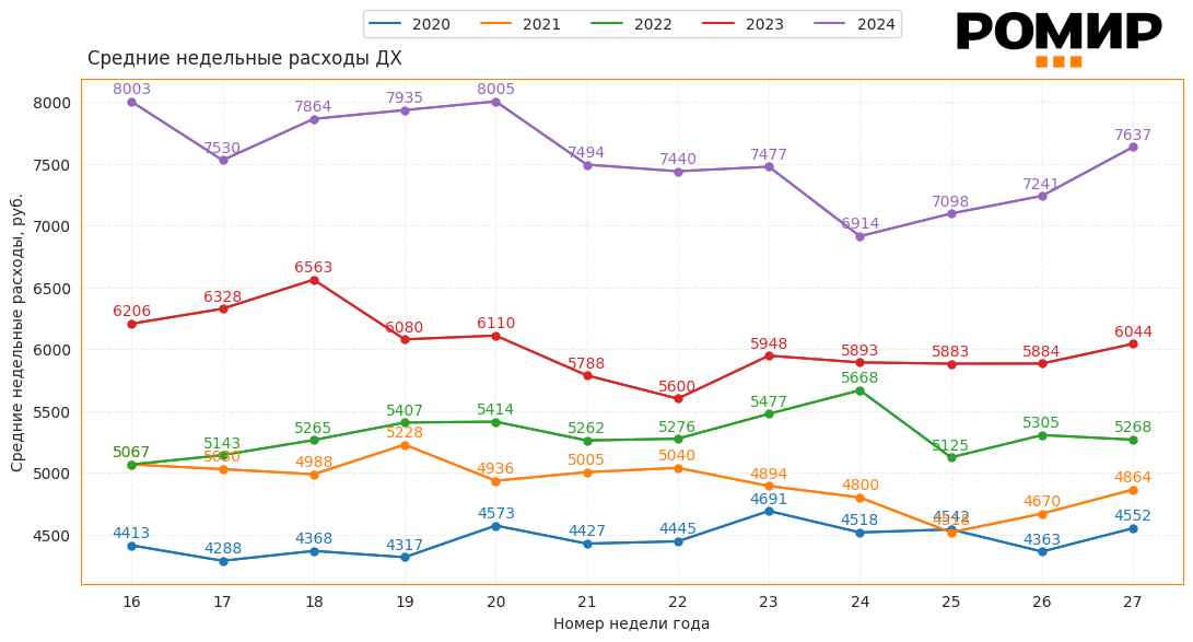 Диаграмма 1. Динамика Индекса недельных расходов, руб., 2020–2024 гг.