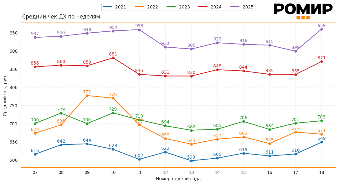 На прошедшей 18 неделе (с 28 апреля по 4 мая) размер среднего чека на покупку товаров повседневного спроса составил 959 рублей, что на 60 рублей или 6,25% больше, чем неделей ранее. По сравнению с аналогичной неделей прошлого года размер среднего чека вырос на 88 рублей, прибавив тем самым 10,1%.