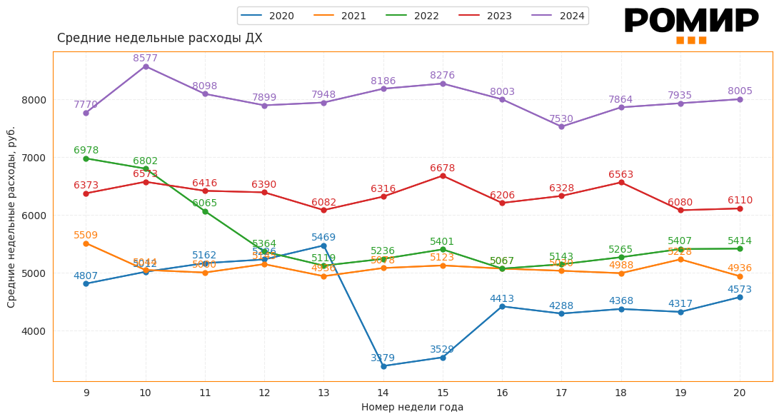 Диаграмма 1. Динамика Индекса недельных расходов, руб., 2020–2024 гг.