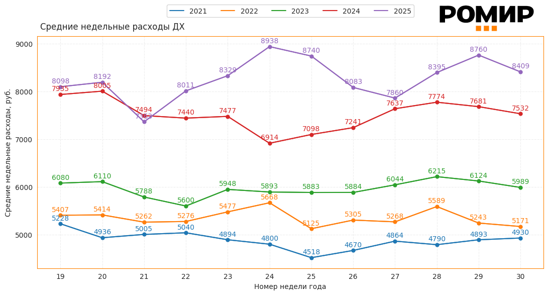 Снижение трат может быть связано с сокращением частоты покупок в этот период. В разгар летнего сезона, когда многие россияне находятся в отпусках, на дачах или вдали от привычной городской суеты, структура и ритм потребления меняются. Это может приводить к уменьшению количества визитов в магазины, что в совокупности отражается на общем объеме недельных расходов домохозяйств.