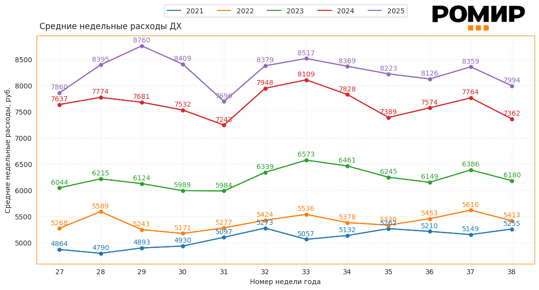 Динамика средних недельных расходов домохозяйств, руб., 2021–2025 гг.