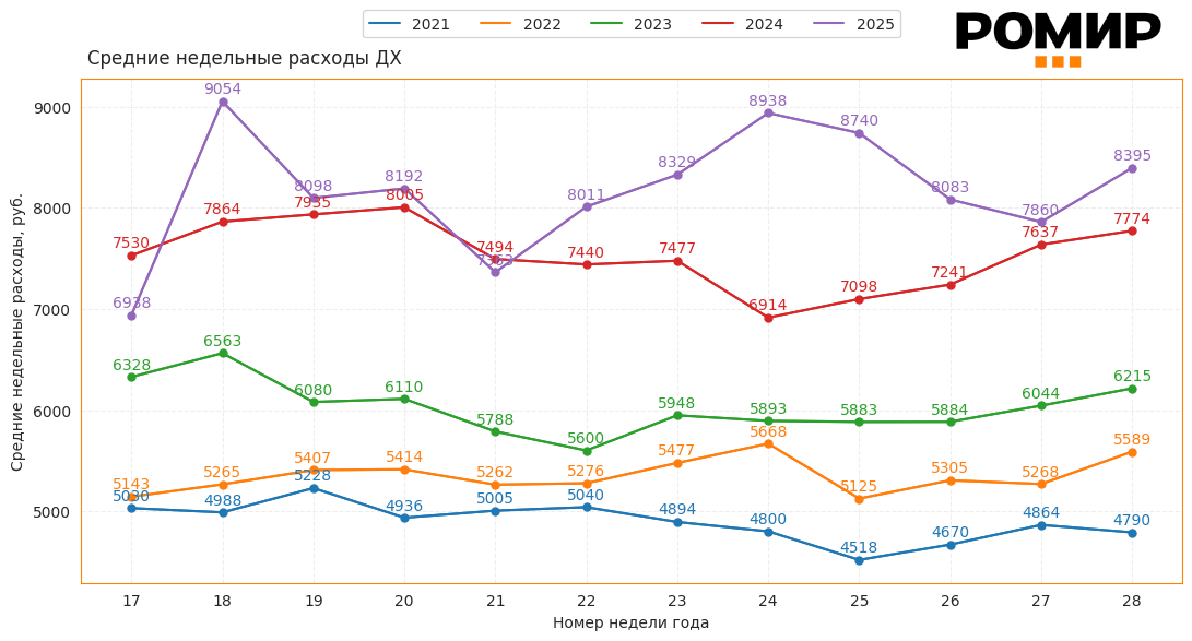 Диаграмма 1. Динамика Индекса недельных расходов, руб., 2021–2025 гг.