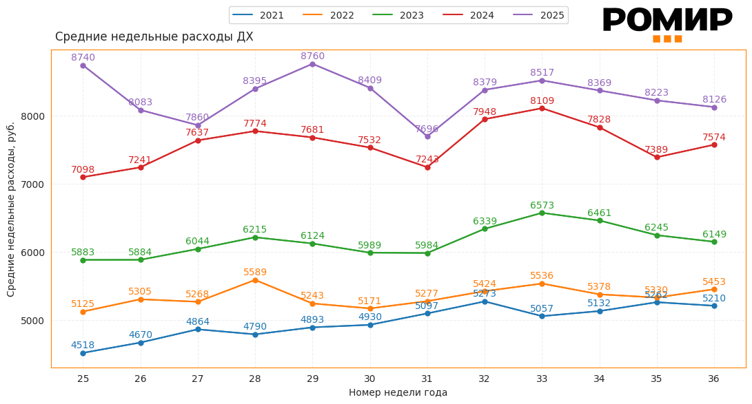 Динамика средних недельных расходов домохозяйств, руб., 2021–2025 гг.