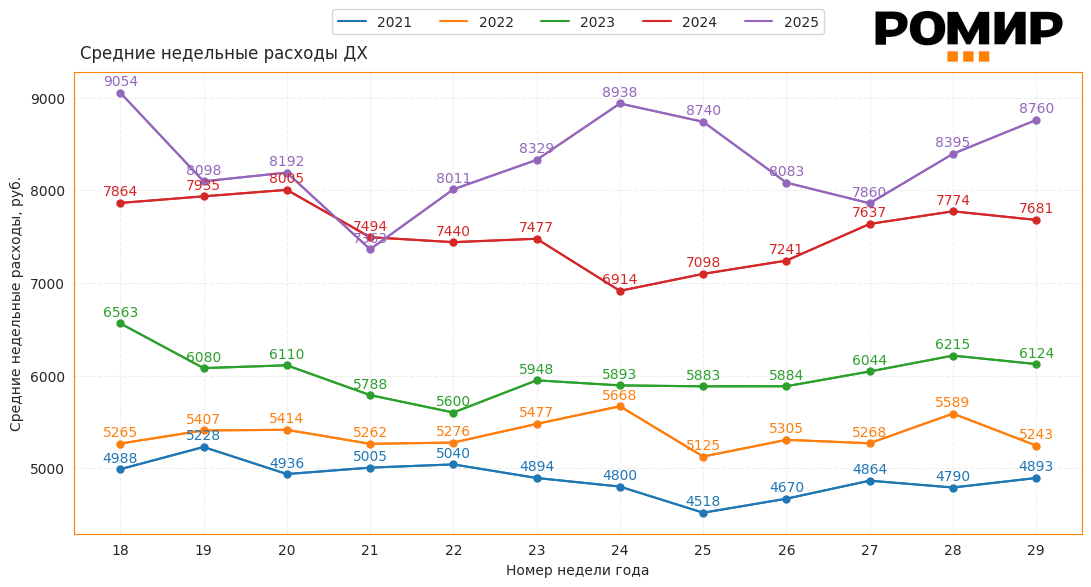 Одной из возможных причин является изменение покупательского поведения, а именно – увеличение частоты покупательских визитов россиян в магазины. Когда семьи чаще совершают покупки, даже при сохранении среднего чека за одну поездку, суммарный объем недельных расходов закономерно возрастает.