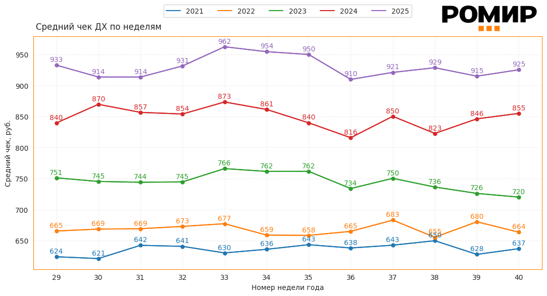 925 рублей составил размер среднего чека на прошедшей неделе с 29 сентября по 5 октября.