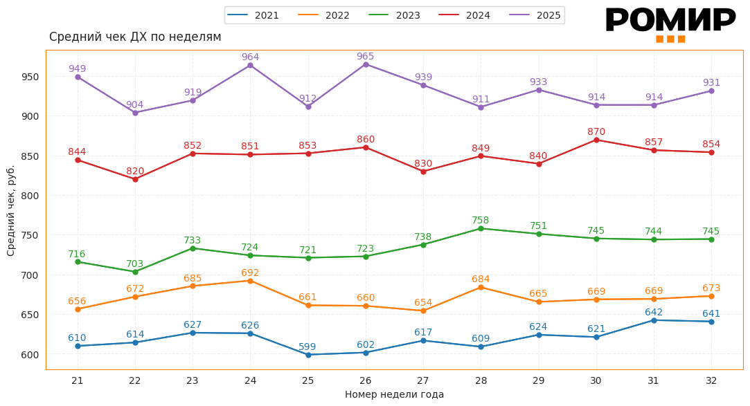 Диаграмма 1. Динамика недельного Индекса среднего чека, руб., 2021–2025 гг..