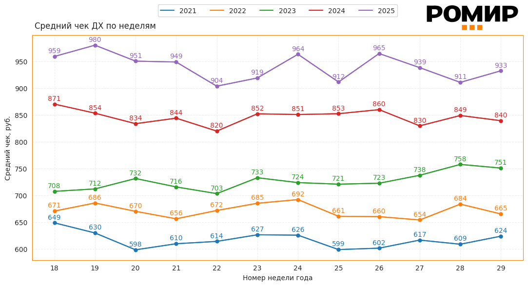 Диаграмма 1. Динамика недельного Индекса среднего чека, руб., 2021–2025 гг..