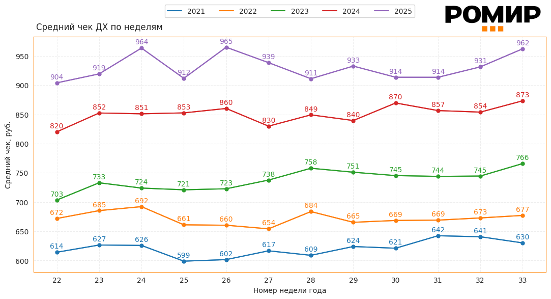 Диаграмма 1. Динамика недельного Индекса среднего чека, руб., 2021–2025 гг..