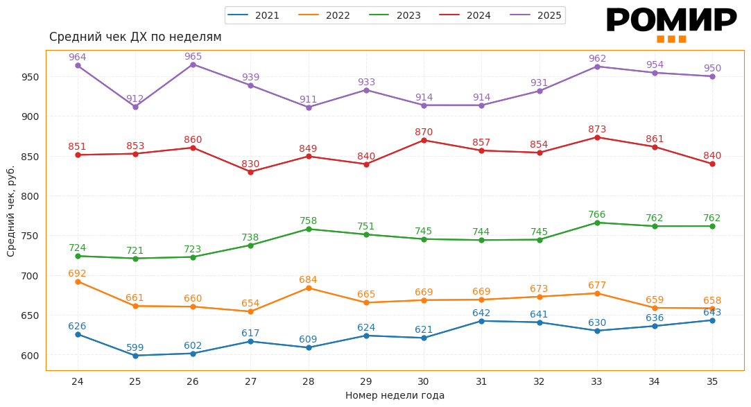 Диаграмма 1. Динамика недельного Индекса среднего чека, руб., 2021–2025 гг..